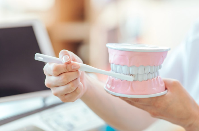お口の中の状況をみて、生活習慣・歯磨きやフロスなどの使用方法を指導します。幼稚園や小学校などに来て大きなお口の模型を持ってお話ししているのを見たことがある方もいるのでは?
